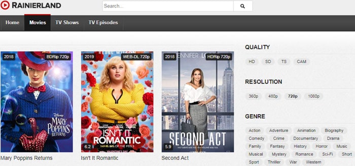 The search bar is divided into different search bar types like genres, new search bar, and new release movies. The most interesting feature is that Rainierland provides the IMDB area where you can find the top movies ranking by the RMDB.