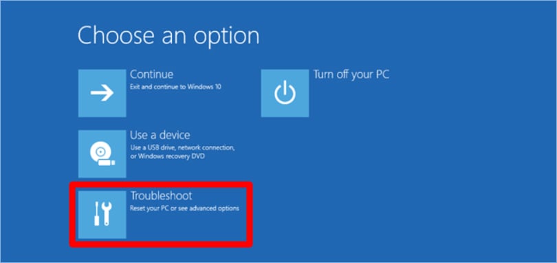 • Then, press & hold the Shift key while clicking Restart. It will cause your PC to restart in Windows Recovery Environment (winRE). You will now see a blue screen with Choose an Option at the top.