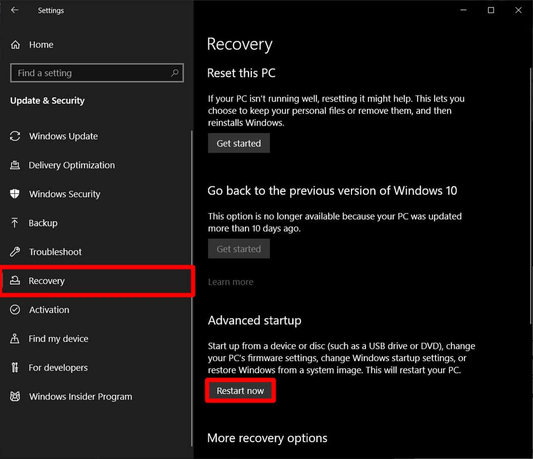 • Next, Under Advanced Startup, press Restart Now. Your PC will restart, and then you will see a Choose an Option screen.