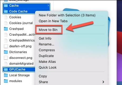 3. You may access these folders by going to the Finder menu and selecting the cache, GPU cache, and code cache options (choose and hold the Command key to do this). Afterward, right-click and select “Move to Trash” (Move to Bin in certain localizations).
