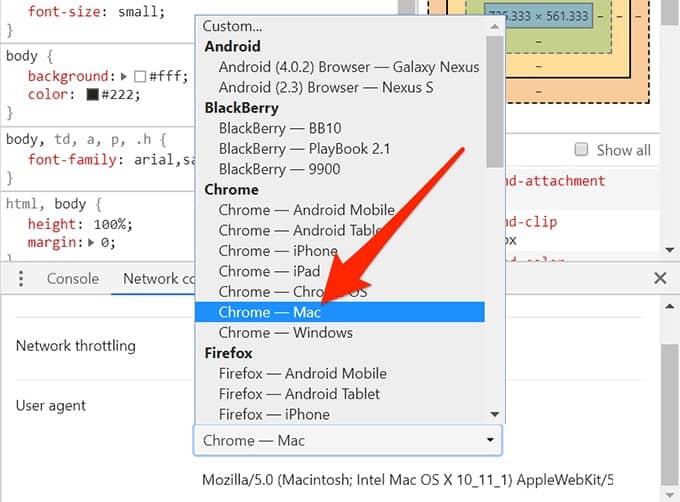 5. Select Chrome – Mac from the drop-down menu in the user agent drop-down list. Again, you’re looking for an alternative to Windows.