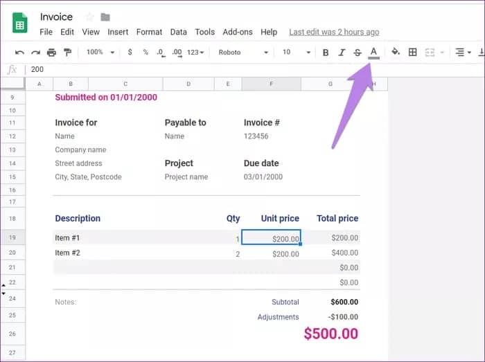 The best thing about Google Sheets invoice templates is that the total amount is calculated automatically. You’ll have to enter the individual details, & the final amount will appear.