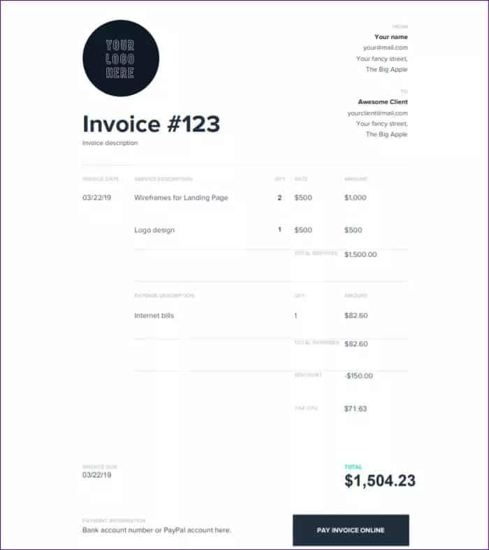 These lines in the previous template of product & sales can bother a person. Fortunately, it provides an alternative. It is a clean template having two separate tables for products and services. You even have a discount and tax on the invoice. Interestingly, the invoice offers two additional features — the ability to add a logo and payment link.