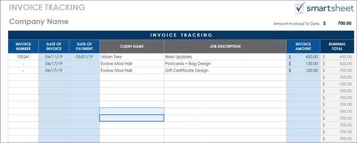 The above invoice templates focus on the client. But if you need to track your invoices in Google Sheets, there is a unique free template. Offered by Smartsheet, the template provides a table with details like invoice number, date of invoice and payment, client name, description, and amount.