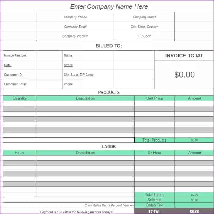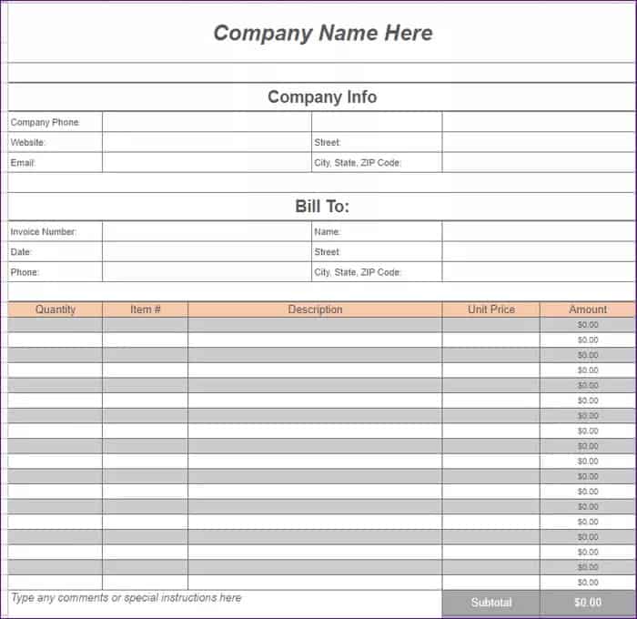 Another clean & blank invoice template is from wiki templates. In this template, every detail of the sender & receiver gets due importance. Unlike other templates, where this info is provided as one set, you’ll find this template slightly different. When it comes to the table, you’ve columns such as quantity, item, description, price, amount, and sales tax.