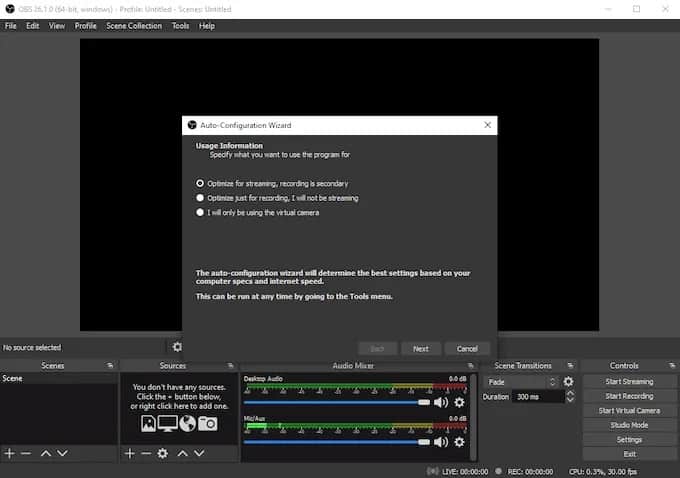 When you set up OBS, it automatically optimizes performance based on how you plan to use it. It presents you with several options: optimize for streaming, optimize for recording, or optimize for use with just the virtual camera. You can now change these settings at any time from within the options menu to help you better tweak performance.