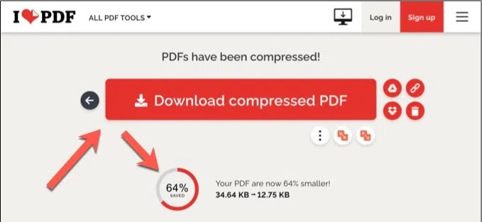 - On the remote server, the PDF compression will be completed. Once the compressed file has finished downloading, click on the Download Compressed PDF button. Here you’ll see the compression ratio (along with the amount of saved file space).