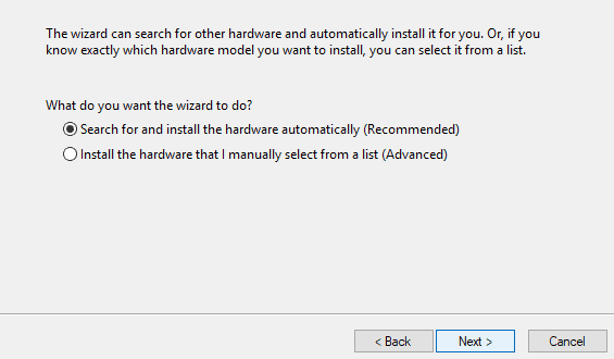- Click on the Next button and then pick the radio button for Search and install the hardware automatically (Recommended).