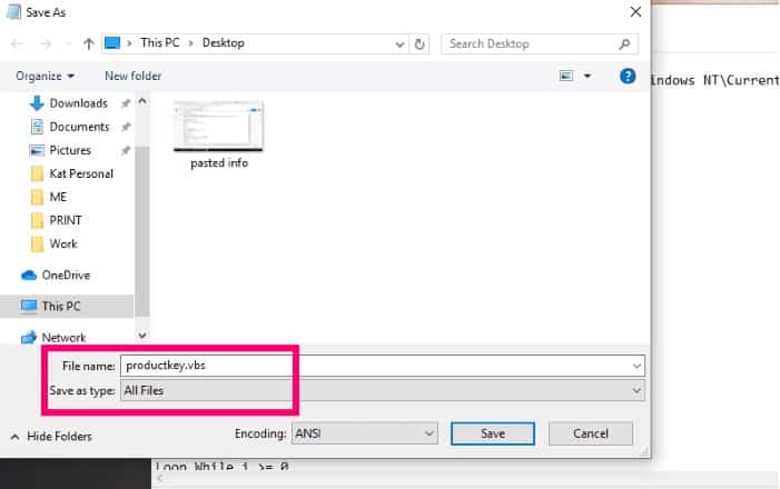 Click ”File” and then ”Save AS” at the top of Notepad – do not simply save it. First, change the file type at the bottom of the save window to “All File Types,” then name it ProductKey.vbs – the .VBS extension is critical. The actual file name is unimportant, as is the location in which you save this text.
